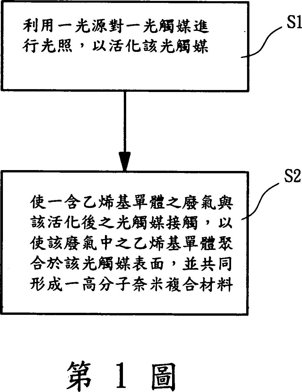 一種含乙烯基單體之廢氣的處理方法,其包含步驟:一光照活化步驟,其係利用一光源對一光觸媒進行光照,以活化該光觸媒;及一通氣聚合步驟,其係將一含乙烯基單體之廢氣與該活化後之光觸媒接觸,使該廢氣中之乙烯基單體聚合於該光觸媒表面,並共同形成一高分子奈米複合材料。藉此達成降低使用成本及提升應用裕度之功效。