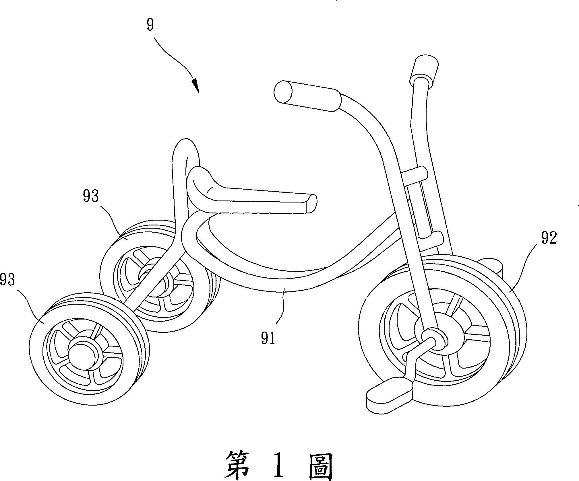 一種腳踏車,係包含:一車主體,具有一主桿、一車頭架及一前輪,該主桿之前端可樞轉的結合於該車頭架,該主桿之後端具有一定位組件,該前輪係可轉動的結合於該車頭架;一樞轉體,具有相對的第一側及第二側,且該樞轉體中央及兩端分別具有一第一樞接部、一第二樞接部及一第三樞接部,該第一樞接部可轉動的結合於該車主體之定位組件,且該第一側朝向該車主體;及一後輪組,包含二後輪,各該後輪均具有一輪座及一輪體,該輪體係可轉動的結合於該輪座,該二後輪之輪座係分別可樞轉的結合於該樞轉體之第二及第三樞接部。