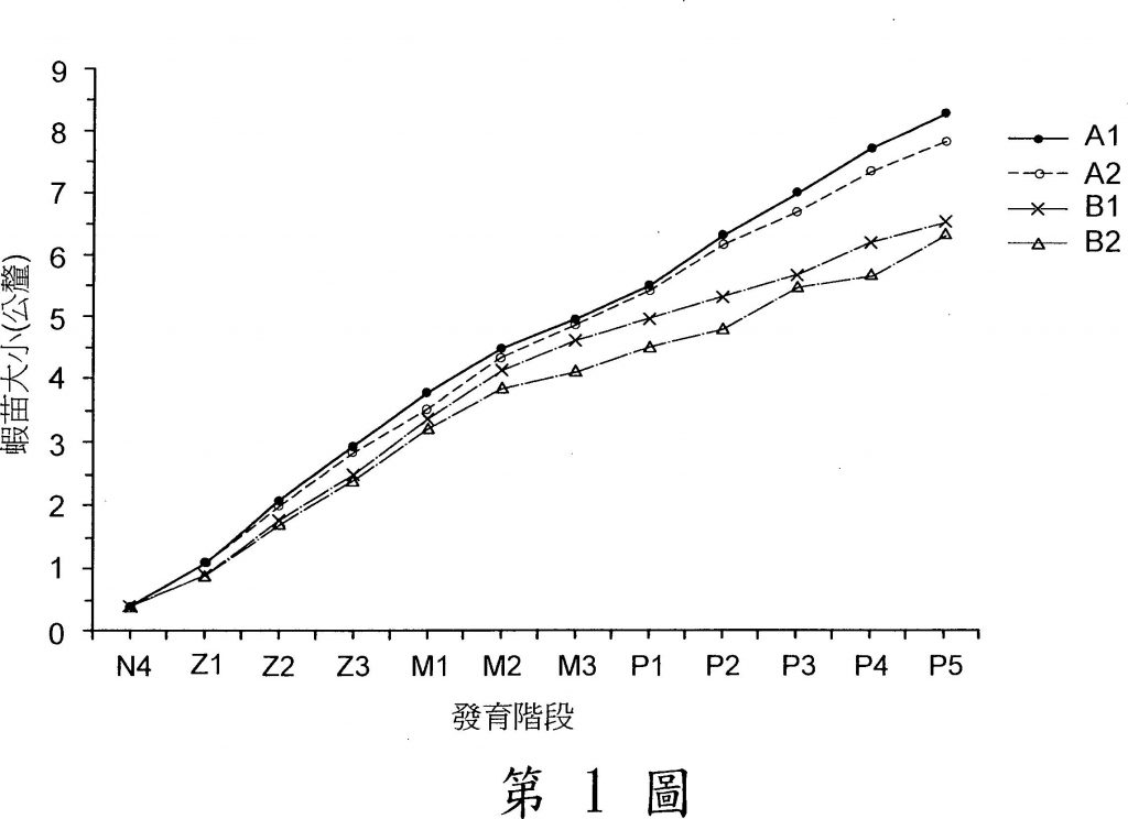 種藻酸鈉用於提升對蝦屬生殖能力之用途,係將藻酸鈉加入一對蝦屬的生鮮餌料中,餵食於眼柄剪除之卵巢催熟處理過程的雌蝦,提升對蝦屬雌蝦之生殖能力、生產品質及所生產子代的生理狀態。