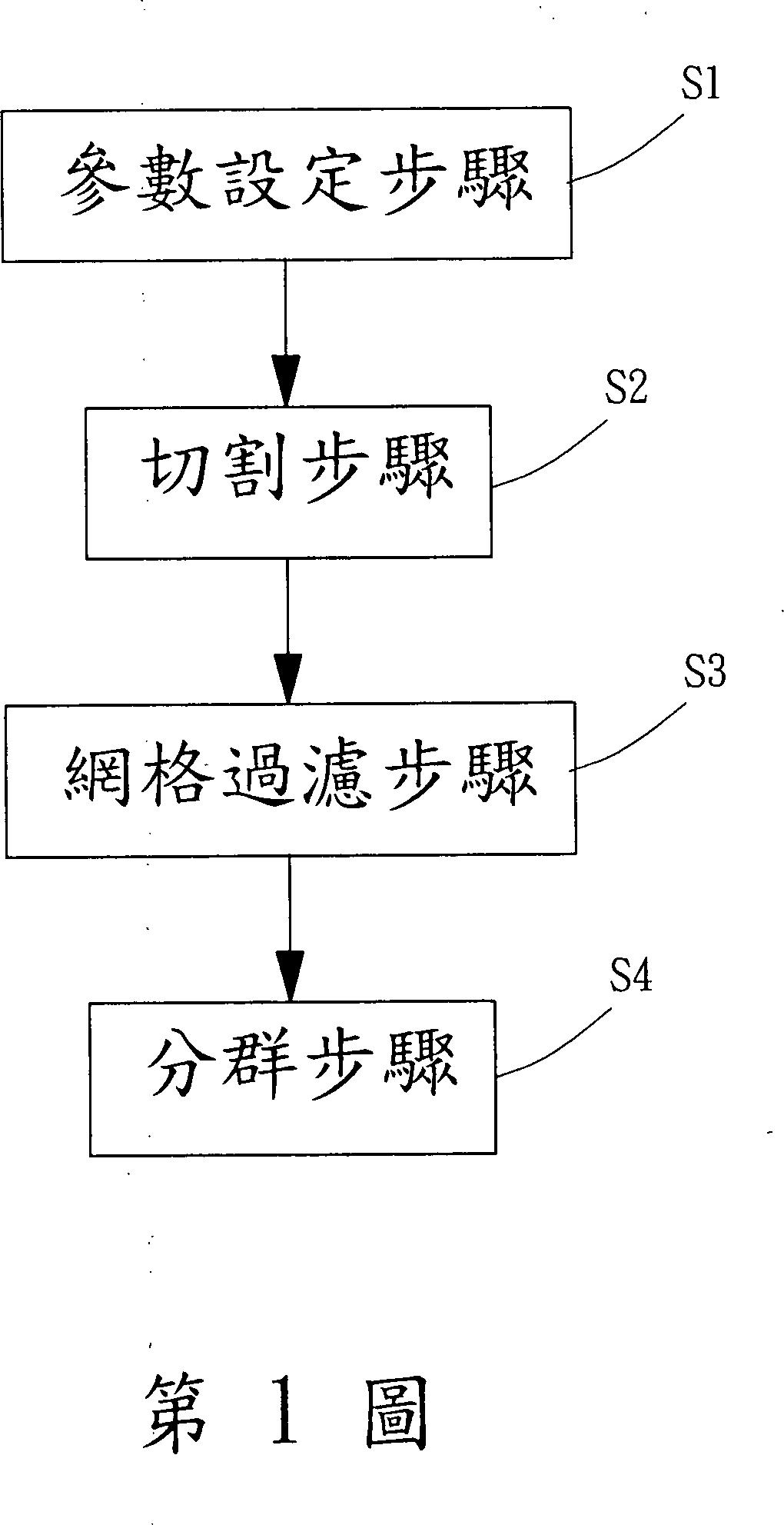 一種網格式資料分群方法,係包含:一參數設定步驟,係設定一切割網格參數及一最小包含點參數;一切割步驟,係將該資料集切割成二維矩陣式之網格;一網格過濾步驟,係依據該最小包含點參數對該數網格進行過濾,分為有效網格與無效網格;及一分群步驟,係僅讀取該每一有效網格,並對該有效網格進行左右循序搜尋合併的動作,將搜尋到之橫向有效網格視為同群,直到左右搜尋至無效網格而終止搜尋後,再進行上下循序搜尋,將搜尋到之橫向有效網格視為同群,待所有有效網格皆已完成二方向之搜尋與分群後,完成分群作業。